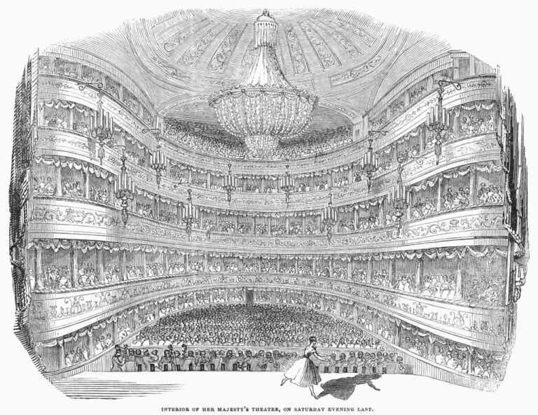 Her Majesty’s Theatre was, during the Romantic Ballet era, one of the leading stages alongside the Salle Le Peletier (whose official name changed several times during the period) in Paris. Several important works were premiered on the stage with the balletmaster Jules Perrot at the helm: Ondine ou La Naïade in 1843, La Esmeralda in 1844, Pas de Quatre in 1845 (where Perrot succeeded in the not insignificant task of engaging Lucile Grahn, Carlotta Grisi, Fanny Cerrito and Marie Taglioni on the same stage) and Catarina ou La Fille du Bandit in 1846. As such, Perrot was named Premier Maître de Ballet in 1842. During this period, most of the ballets were created to music by Cesare Pugni, and a new position was created for him: Composer of the Ballet Music to Her Majesty’s Theatre in 1843.